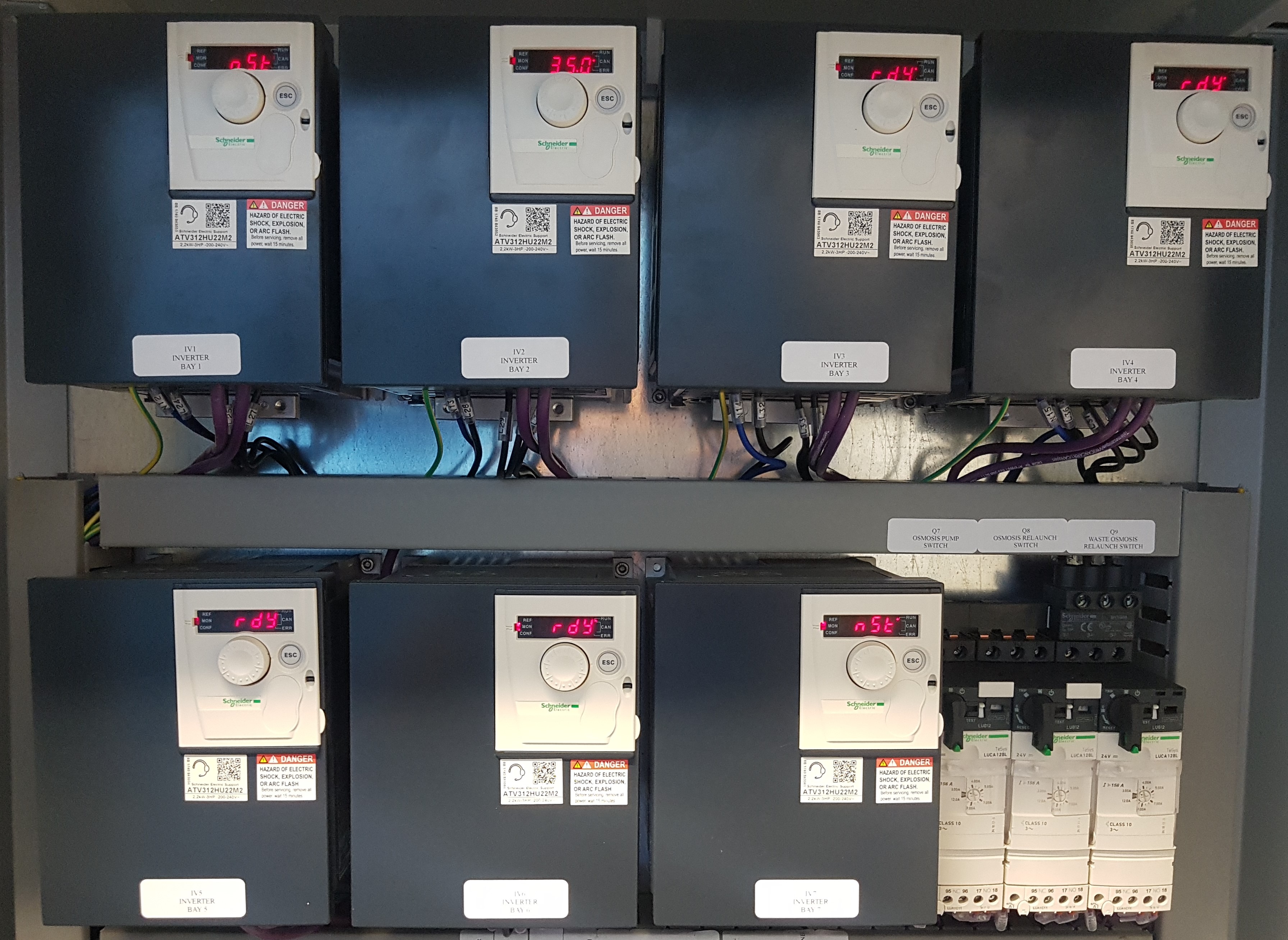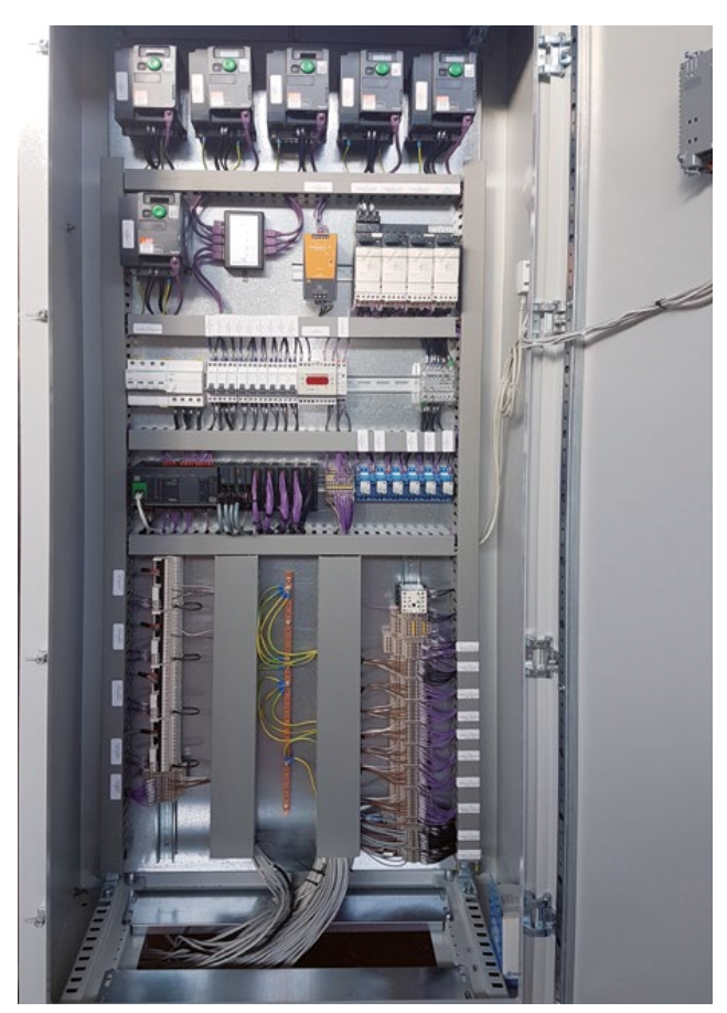 Vsi deli za avtomatizacijo in zaščito so znamke SCHNEIDER ELECTRIC. Nameščeni so znotraj elektro omarice, ki zagotavlja ustrezno zaščito IP55. Vsak posamezen del sistema je zaščiten s toplotno magnetnim stikalom ali diferencialom.
